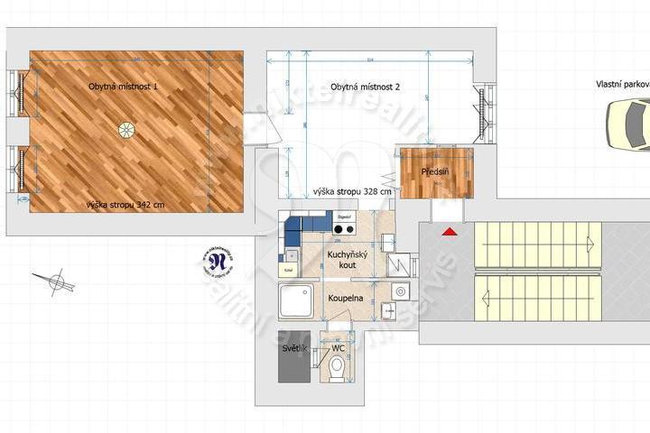 K bytu rovněž náleží samostatné parkovací stání, na nějž je přímý výhled z bytu + zadní východ domu. Současně je k dispozici i sklep.