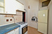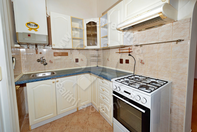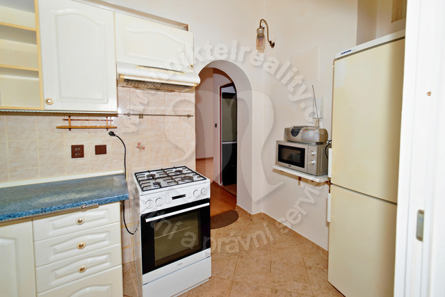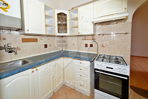 Členění bytu: kuchyňský kout (5,5 m2) s osazenou kuchyňskou linkou, nerezový dřez, kombinovaný kuchyňský sporák, mikrovlnná trouba. Na zemi položena keramická dlažba.
