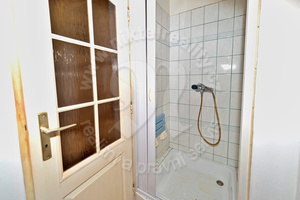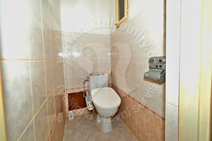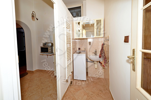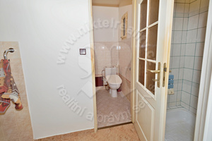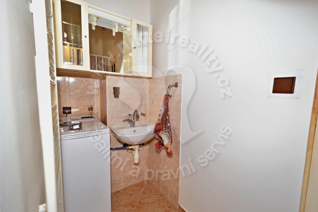 Z kuchyňského koutu je rovněž vstup do koupelny (3,1 m2) s instalovaným prostorným sprchovým koutem, umyvadlem se spodní skříňkou a místem na pračku, včetně přípojek pro ní. Vše realizováno ve světlém, béžovém keramickém obkladu, na zemi položena keramická dlažba. Dále na koupelnu navazuje toaleta (1,1 m2).